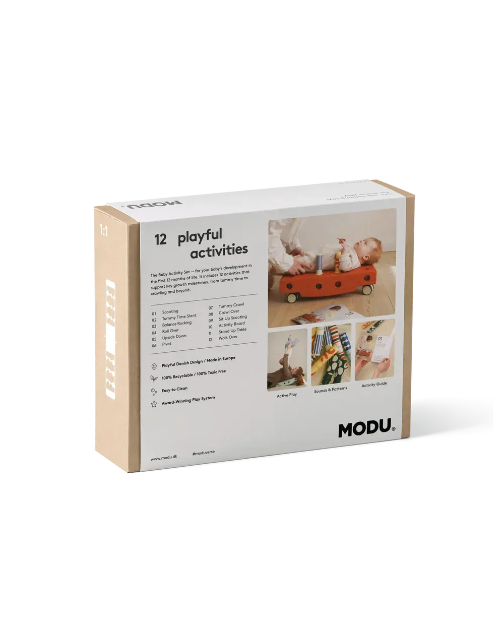 Set di attività per neonati MODU: 12 attività ludiche per i primi 12 mesi di vita. Progettato da esperti nello sviluppo del bambino, questo set include una guida completa con strumenti, nozioni ed esercizi che supportano le principali tappe della crescita del tuo bambino: dal gioco a pancia in giù al gattonamento e oltre. Come parte dell’esperienza, riceverai dei sonagli appositamente progettati con suoni e motivi divertenti, perfetti per la stimolazione sensoriale e l’esplorazione. Benvenuto in un anno pieno di divertimento, gioco e sviluppo!