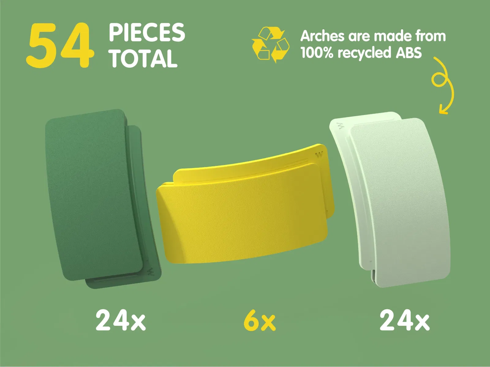 Arches è realizzato in Europa con plastica riciclata. È resistente, sicuro e progettato per anni di gioco open-ended. Poiché utilizziamo materiali riciclati, possono verificarsi piccole variazioni di colore – un promemoria giocoso che la sostenibilità rende ogni set unico.